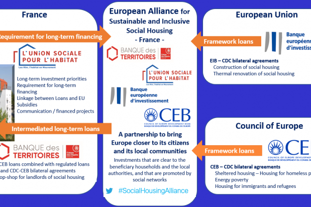 The partnership aims to foster access to European financing by social housing bodies in France for long-term investments in social housing. This alliance forms part of the process of implementation of the Investment Pact signed by all of the French players in social housing. The intermediation mechanism is designed to ensure that French social housing operators have straight-forward, equitable and coherent access to European financing and that the funding is available for all investment projects.